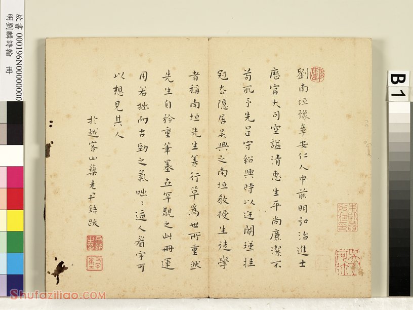 释文:劉南垣豫章。安仁人。中前明弘治進士。歷官大司空。諡清惠。生平上廉潔。不苟取。予先是守紹興時。以迕閹瑾。挂冠去。隱居吳興之南垣。教授生徒。學者稱南垣先生。善行草。為世所重。然先生自矜。重筆墨。世罕覯之。此冊運用若拙。而古勁之氣咄咄逼人。眉宇。可以想見其人。於越客山藮老尹鋙跋。