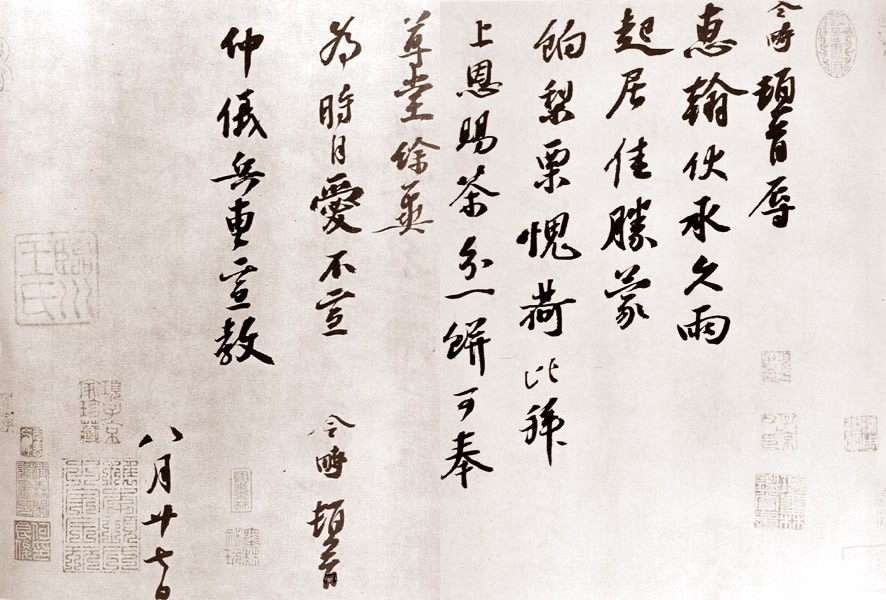 令畤顿首: 辱惠翰,伏承久雨起居佳胜。蒙饷梨栗,愧荷。比拜上恩赐茶,分一饼可奉尊堂。馀冀为时自爱。不宣。令畤顿首,仲仪兵曹宣教。八月廿七日。